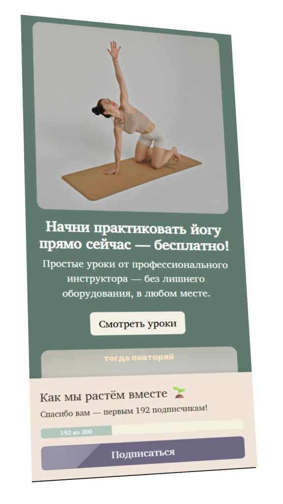 Что сделано: лендинг с призывом подписаться и скрипт который отправляет событие подписки в Яндекс метрику. Обучение РК на подписчиков.